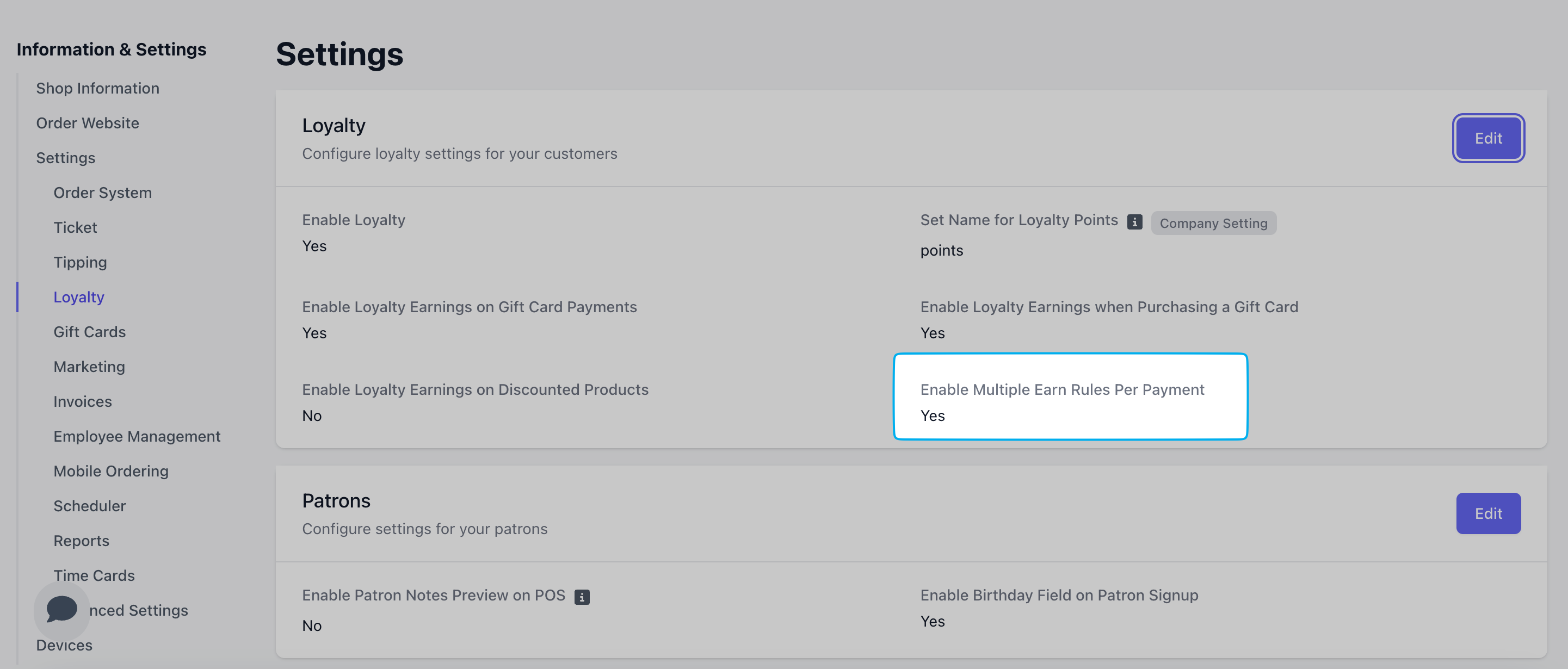 Rewards Enabled = Yes Terminology: Determine the name of your loyalty earnings (points, stars, stamps, etc) Ignore Loyalty for Gift Cards as a Payment: If Yes, transactions purchased with a gift card will not earn loyalty points. Ignore Loyalty for Purchased Gift Cards: If Yes, the purchase of a gift card will not earn the patron loyalty points. Ignore Loyalty for Already Discounted Items: If Yes, purchases of already discounted items will not earn the patron loyalty points. One Earn Rule Per Payment: