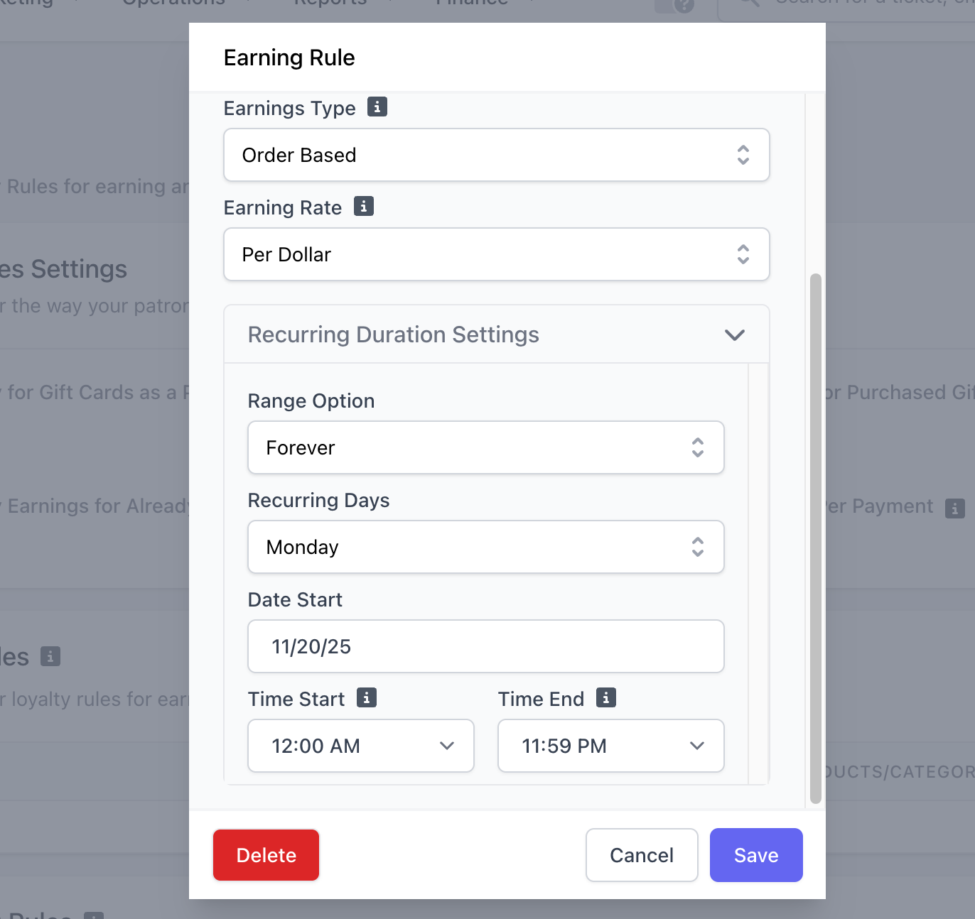 Select Forever keep this setting active indefinitely. Select Date Range to specify a start and end date for this earning rule.