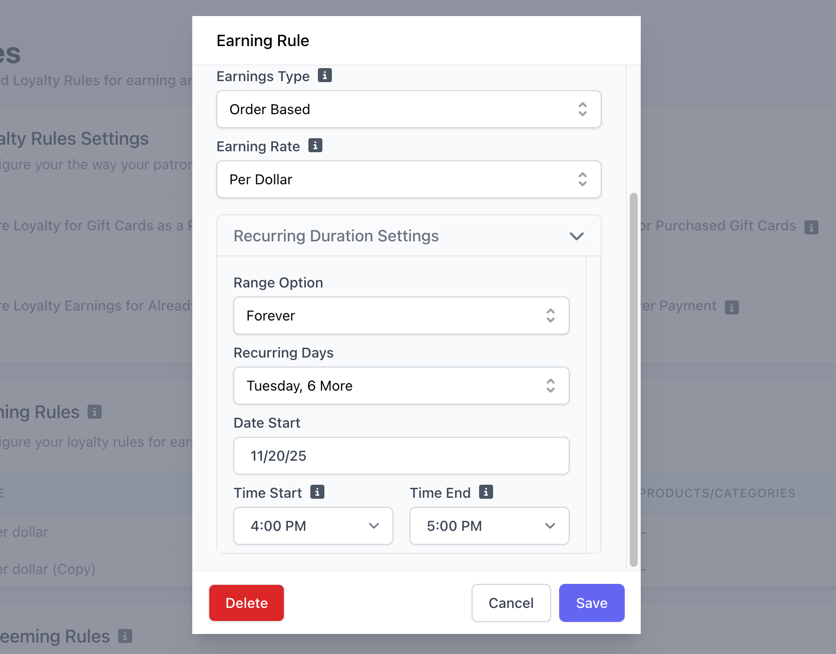 Enable your store’s loyalty earning rules on certain days of the week and/or specific times of day. i.e., Double Point Tuesday or Happy Hour earnings
